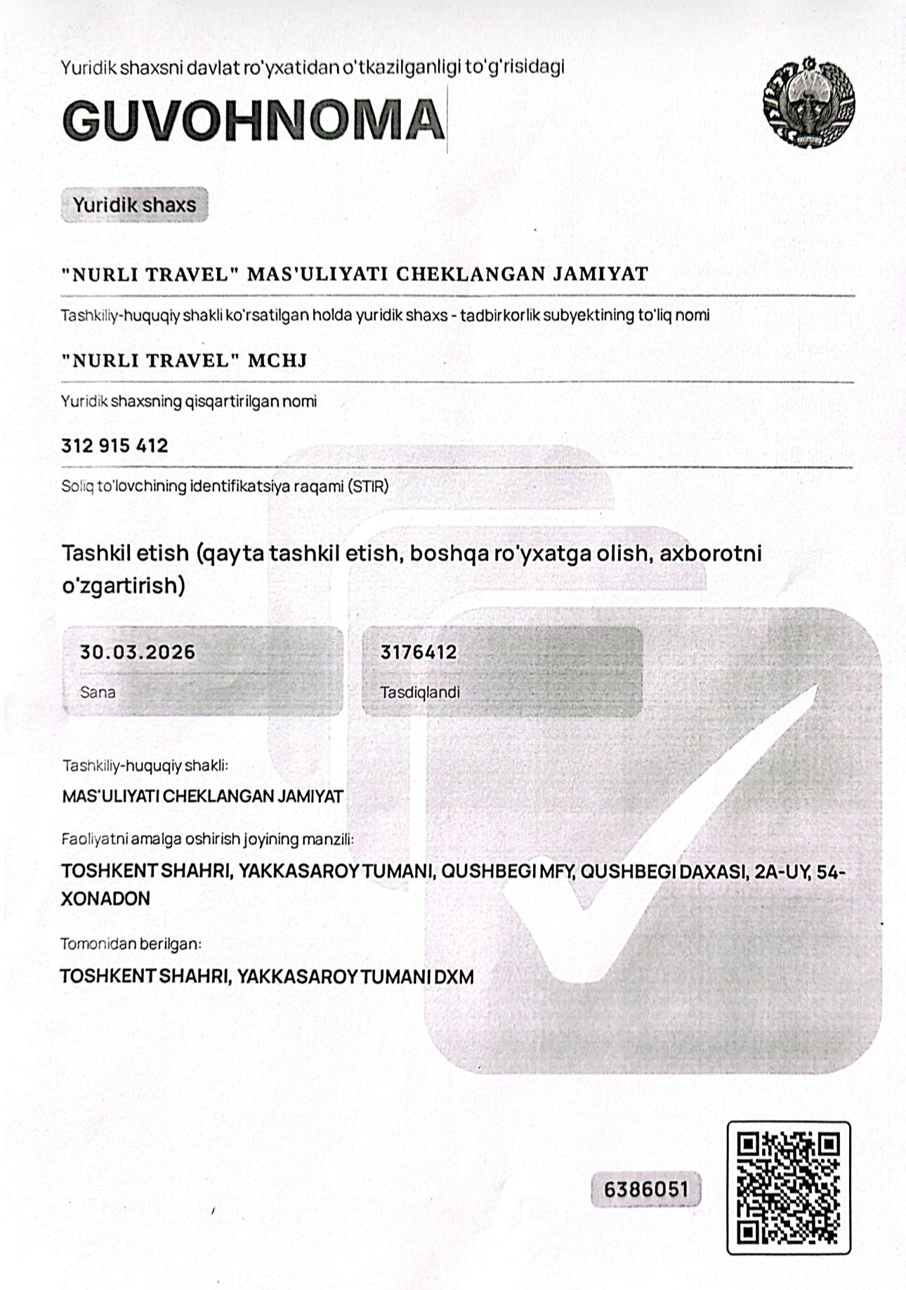 Barcha sayohatlar to'liq sug'urtalangan va qonuniy hujjatlar bilan ta'minlangan.